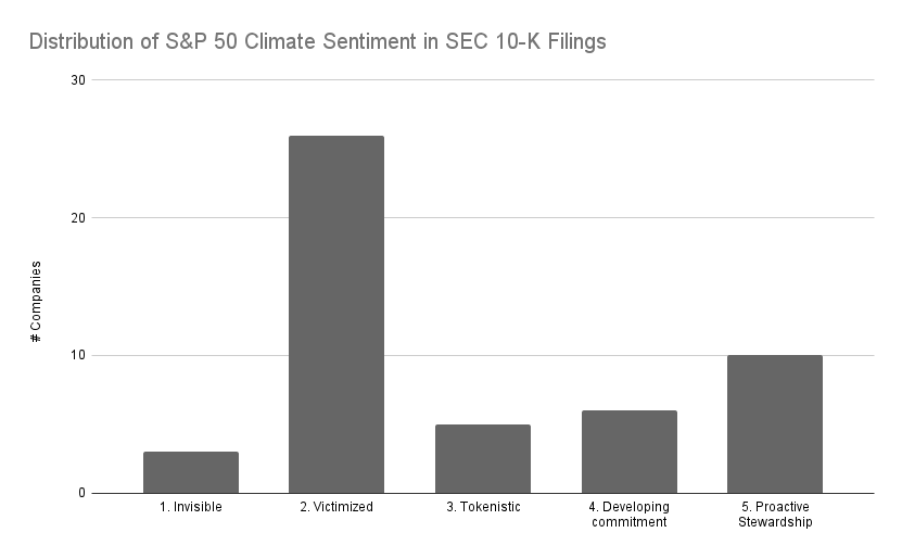 This research has provided a view into of how leading S&P 50 companies address climate-related issues within their SEC 10-K filings. A climate sentiment framework has been created, categorizing companies into five distinct levels based on both their acknowledgment of climate change as a business risk and their commitment to climate action within these filings.