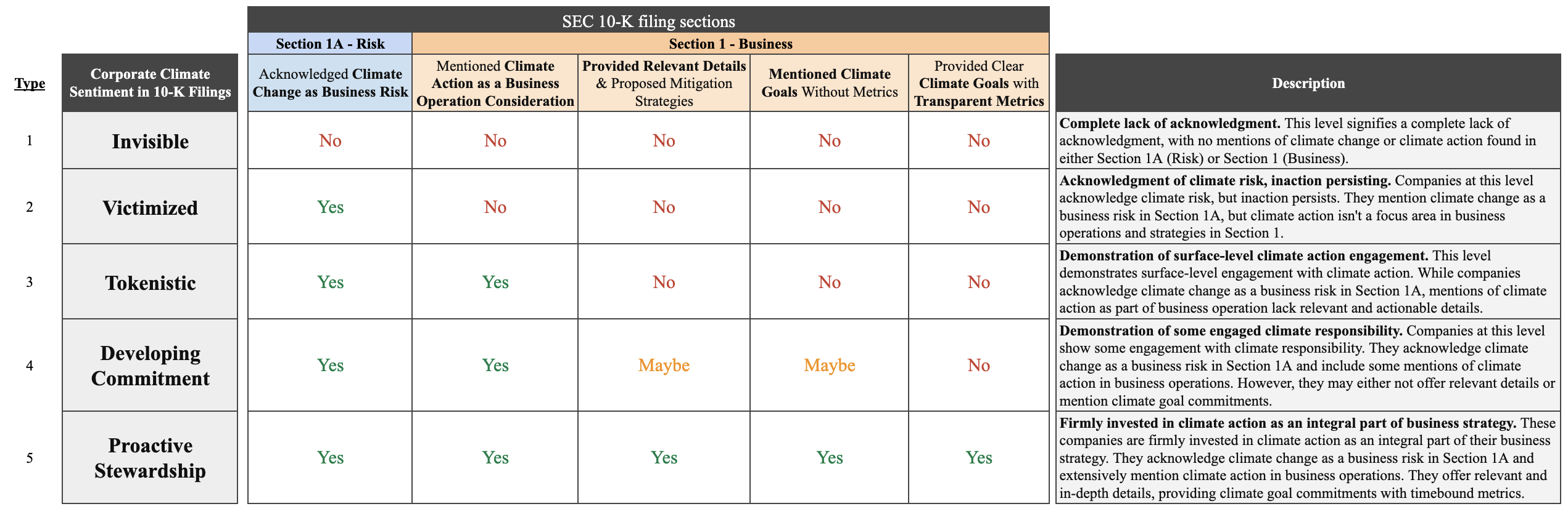 At the "invisible" level, these companies demonstrate a complete lack of acknowledgment of climate-related issues, with no mention of climate change or climate action found in either Section 1A (Risk) or Section 1 (Business) of their 10-K filings. This signifies a concerning absence of awareness or recognition of the importance of climate-related considerations within their operations and strategies, suggesting that even if they incorporate such considerations in their business operations, they may not perceive them as significant enough to disclose to investors in their 10K filings.